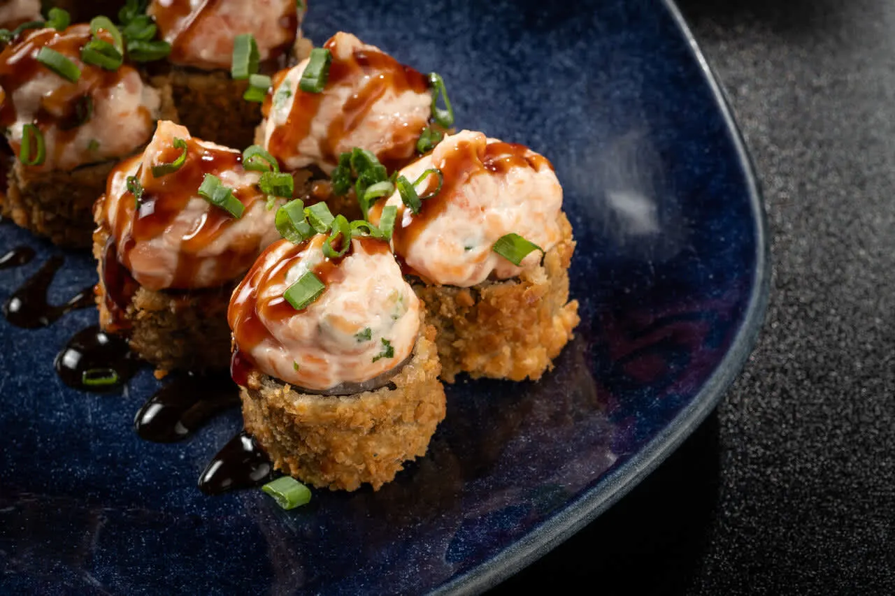 Hossomaki de salmão, empanado, coberto com patê de salmão, molho tarê e cebolinha. 08 unidades.
