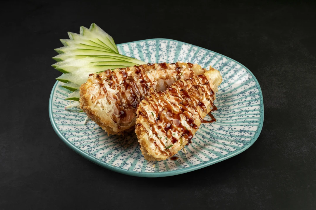 Sushi de salmão, arroz, cream cheese, gergelim e crispy de alho poró em formato de cone.