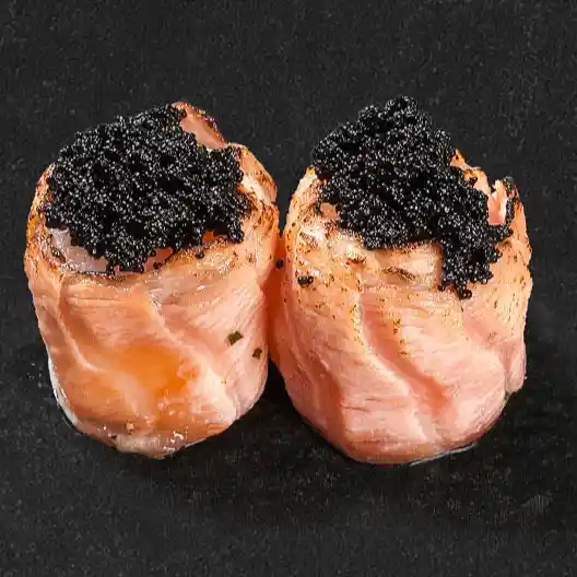 Torre de arroz envolta por salmão trufado, coberta com ovas de masago. 02 unidades.