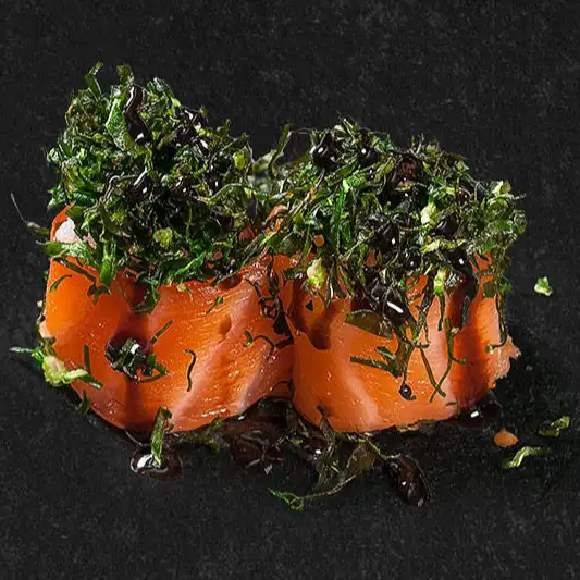 Torre de arroz envolta por salmão, coberta com salmão batido e cebolinha. 02 unidades.