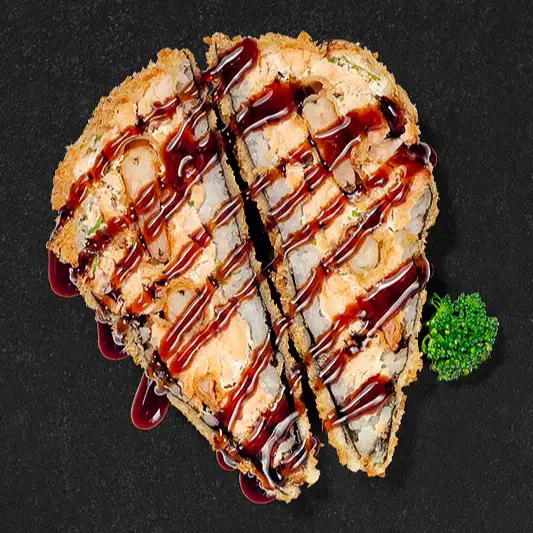 Sushi de salmão, cream cheese, camarão empanado, cebolinha, empanado em massa especial, frito e coberto com molho tarê em formato de cone.