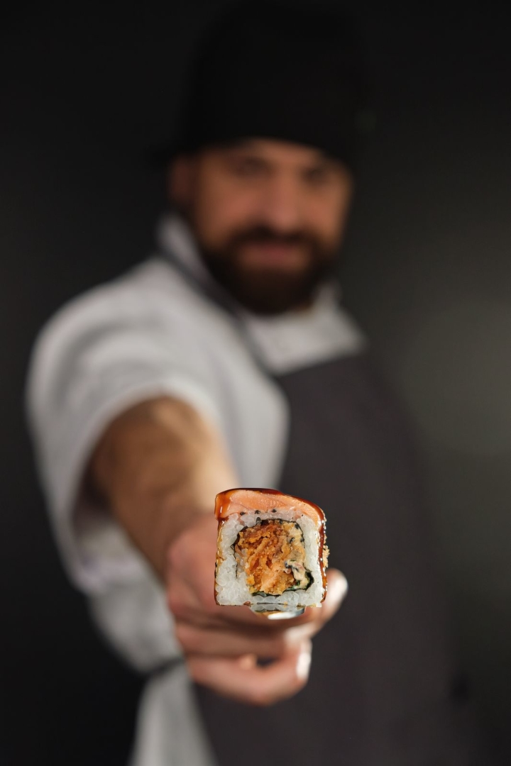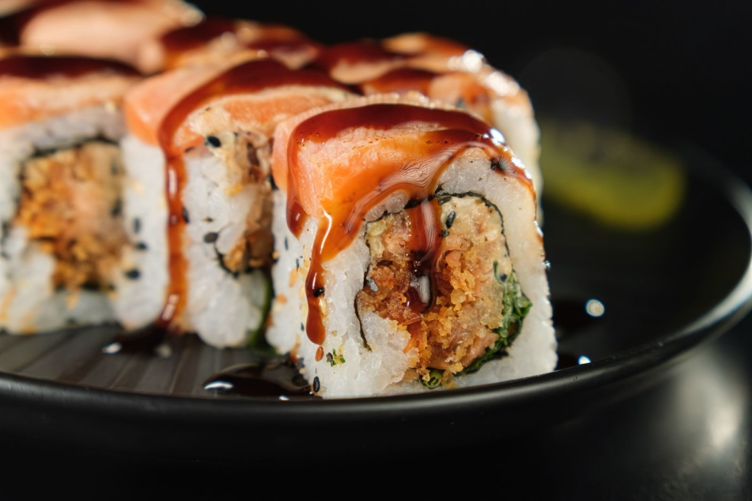 Uramaki de salmão empanado, teriaki cremoso, rúcula, finalizado com neta de salmão maçaricado e molho tare. 08 und.